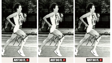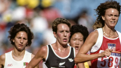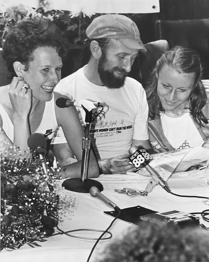 Anne Audain (left) with NYC Marathon founder Fred Lebow and nine-time NYC Marathon winner Grete Waitz attending a press conference held after Anne defeated Grete in the 1983 Leggs Mini Marathon in Central Park.